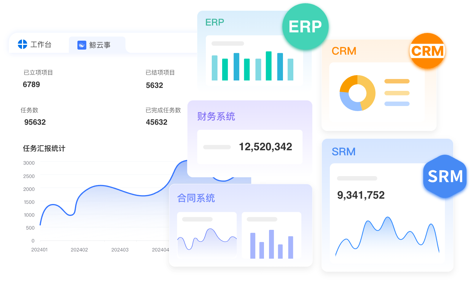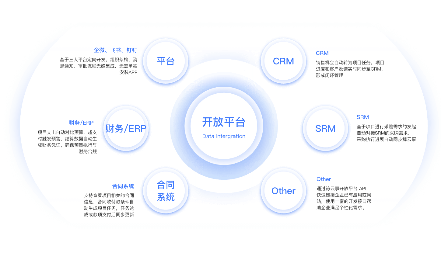 鲸云事开放平台通过零代码、低代码能力,高效、灵活、稳定的连接企业第三方系统, 结合客户实际业务场景实现项目与CRM、采购系统、费控系统、档案系统、钉钉、企业微信、飞书等系统的数据同步, 提高业务协同效率