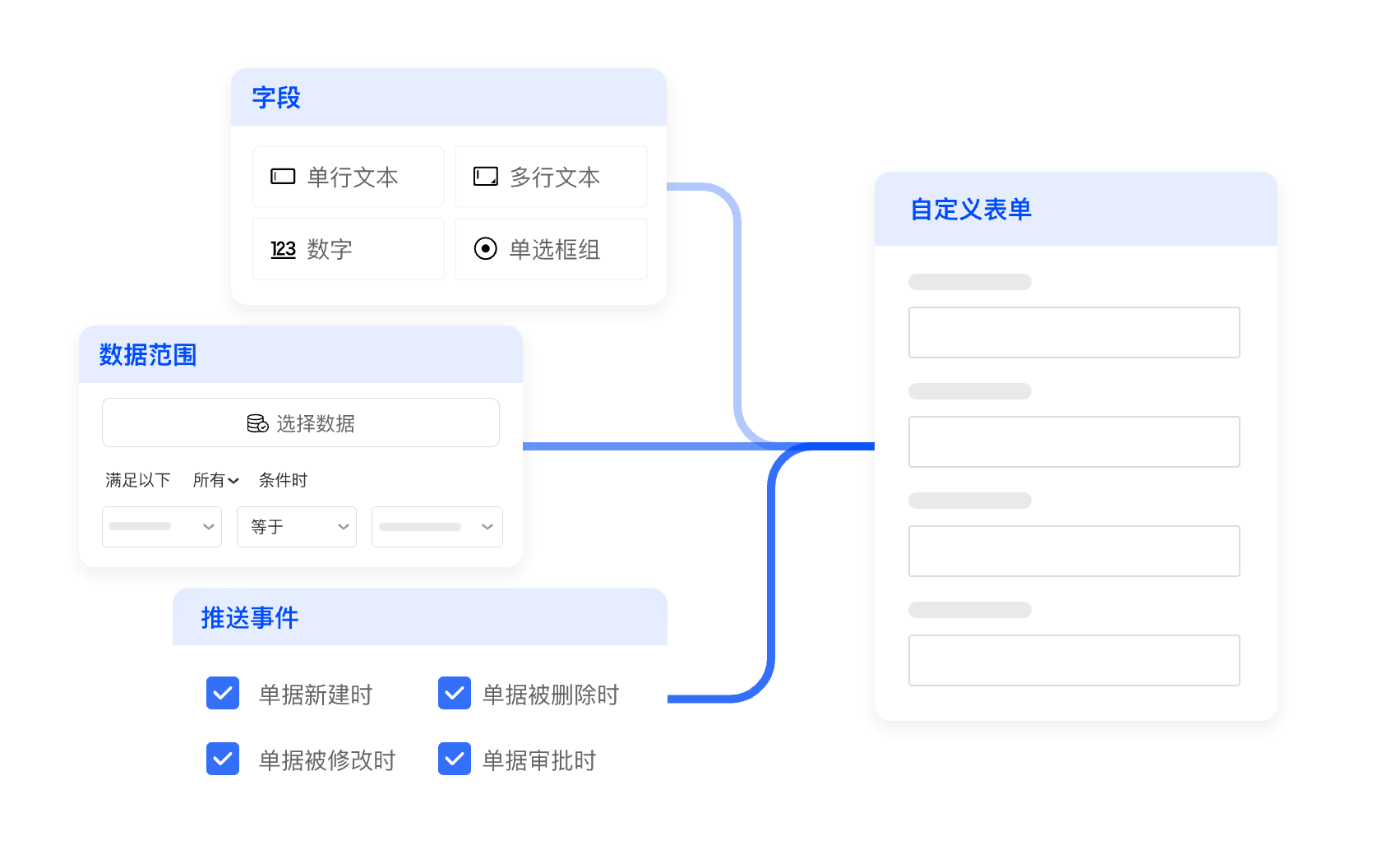 通过配置表单和字段映射、数据范围、触发事件以及同步过程中的数据处理机制满足各种场景下单向或者双向的数据同步诉求