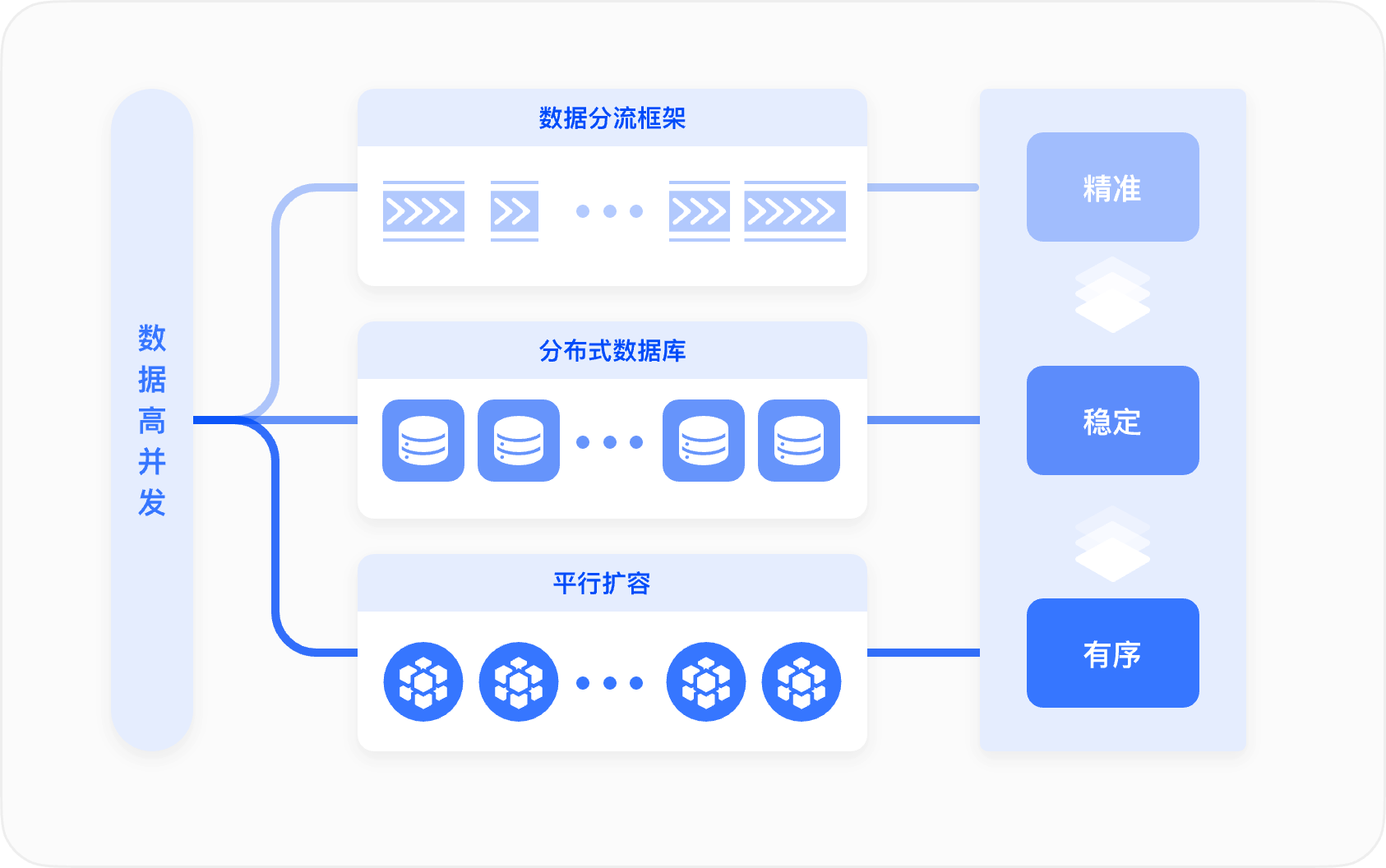 海量数据高并发的冲击下,以数据分流框架、基于租户的分布式数据库、平行扩容等能力,保证数据精准、稳定、有序同步