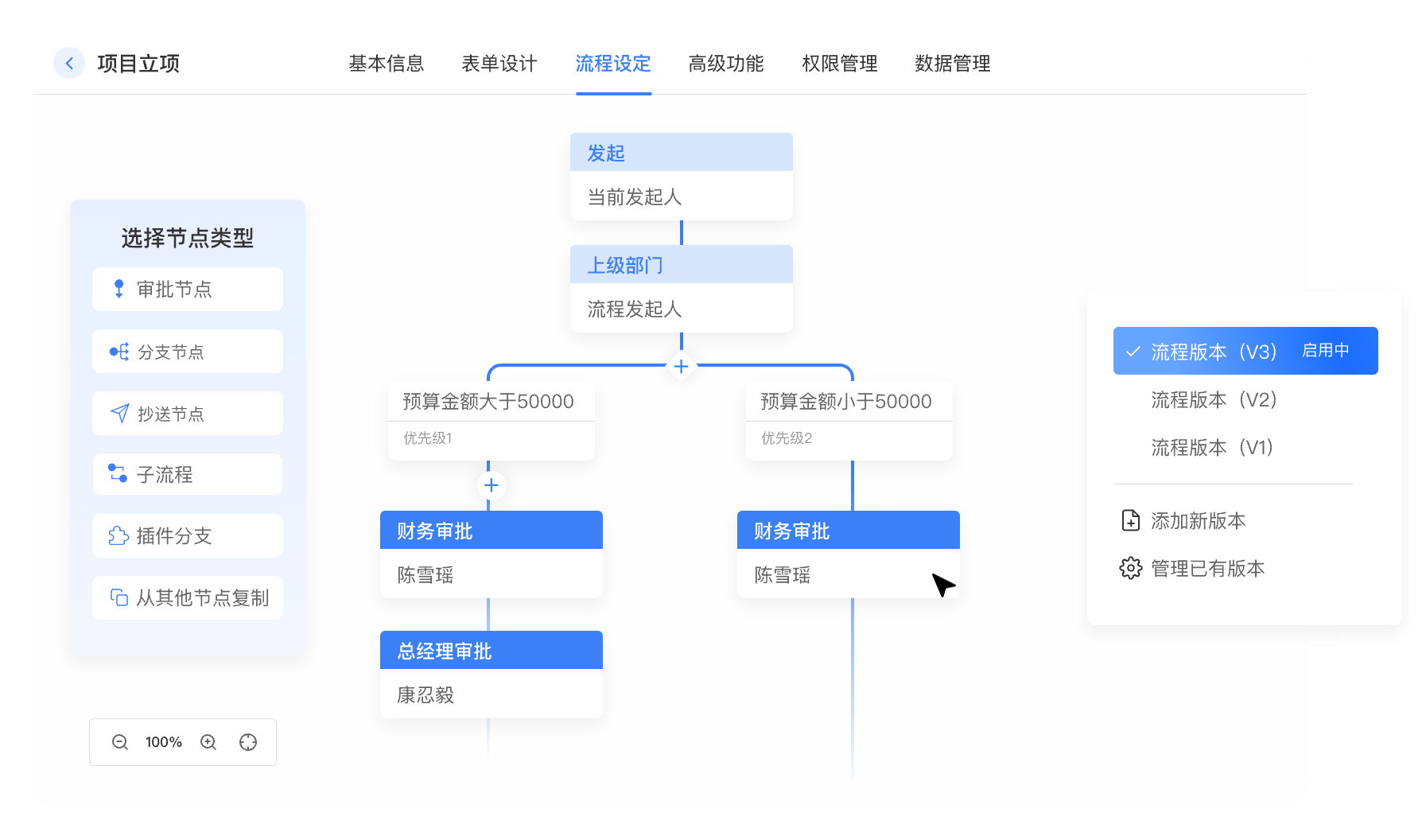 通过简单的拖拉拽操作,最快5分钟即可设计出一个实用的流程,将原线下审批流程搬到上鲸云事上